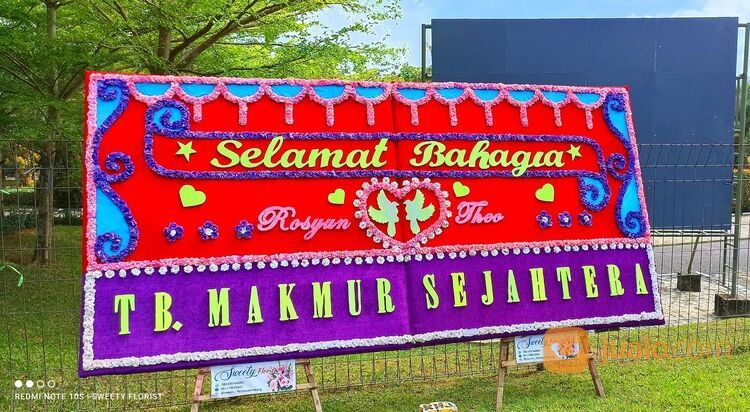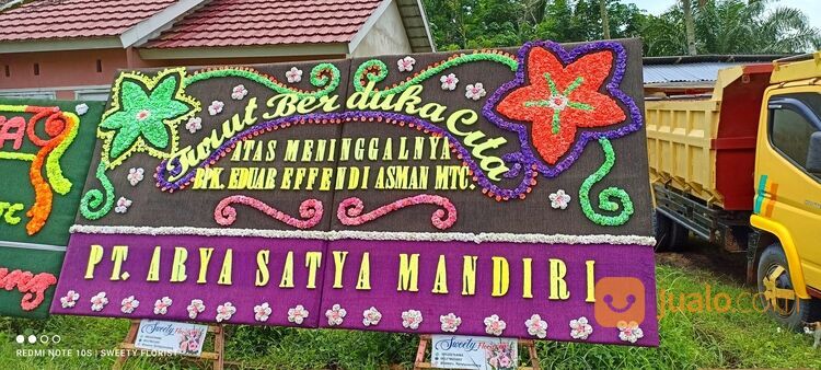 Sweety florist palembang, menyediakan karangan bunga (Bunga papan) untuk ucapan selamat, duka cita dll. Tulisan menggunakan styrofoam tebal 1,5cm sehingga tulisan terlihat jelas dibaca, timbul dan tidak menumpuk2.